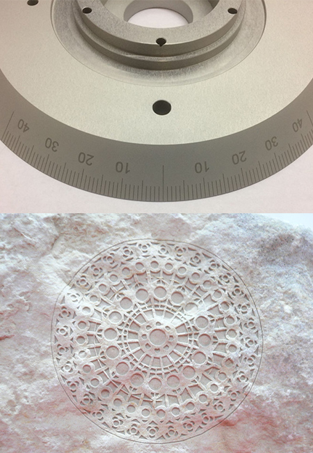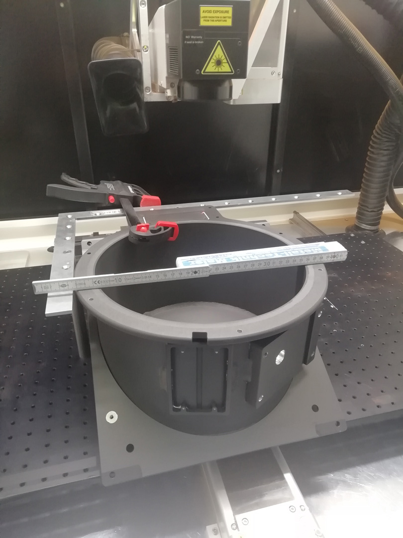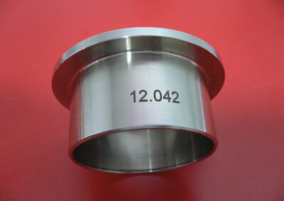 Wir beschriften auch runde Teile auf der Außenkontur oder innen. Unsere Anlagen sind mit Rundachsen ausgestattet, die selbst größere Werkstück-Durchmesser aufnehmen können.