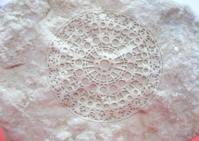Dieses Verfahren eignet sich für eine Vielzahl von Materialien, wie Metall, Kunststoff, Glas, Holz oder Stein (im Bild unten) und ermöglicht die Beschriftung von Logos, Schriftzügen oder Seriennummern. Durch die extrem feine Fokussierung des Lasers entstehen Gravuren mit hoher Beständigkeit und Präzision. Lasergravuren sind langlebig, resistent gegen Abrieb und Chemikalien und daher ideal für industrielle Anwendungen und individuelle Designs.